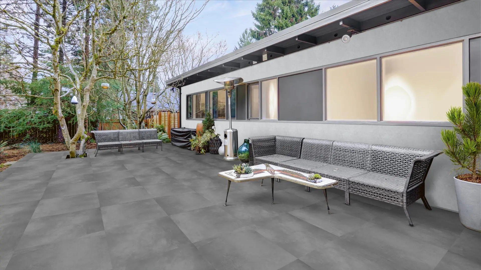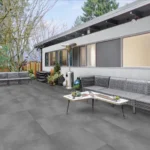 A deep charcoal porcelain surface with a uniform cement-inspired texture, delivering a bold and modern architectural feel.