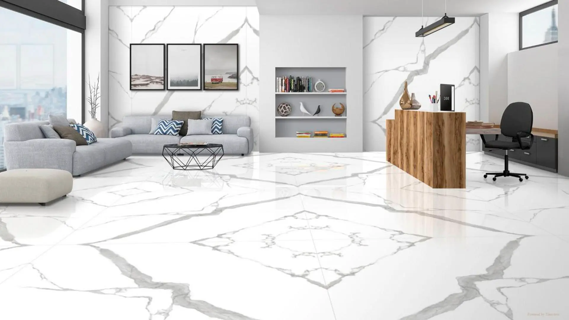 A premium white backdrop contrasted with bold, defined grey veining in bookmatch layouts—sophisticated, luxurious, and perfect for hero surfaces.