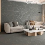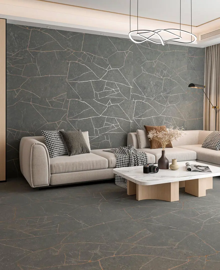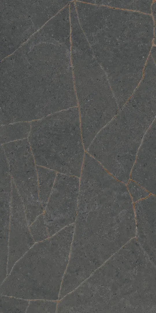 Deep anthracite tones with organic mineral texture, bringing strong presence and contemporary refinement.
