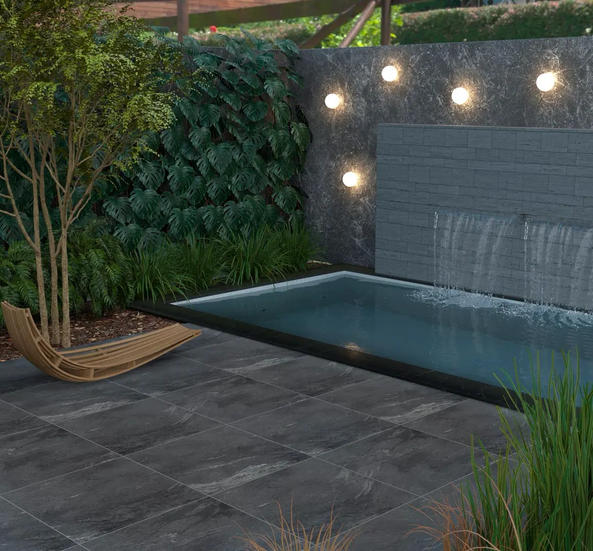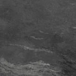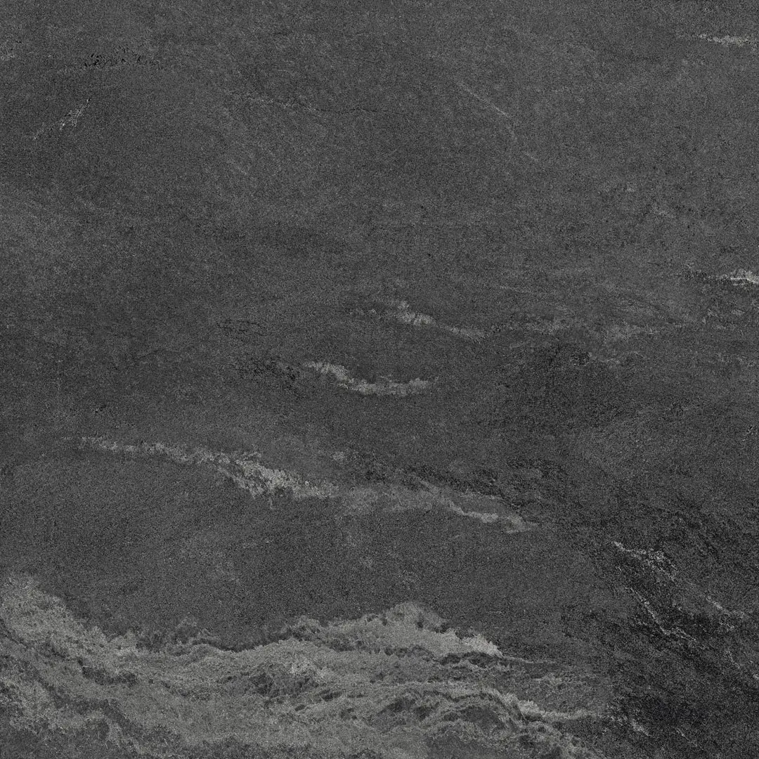 A deep charcoal porcelain surface with layered stone movement, providing rich visual depth and a bold, natural character.