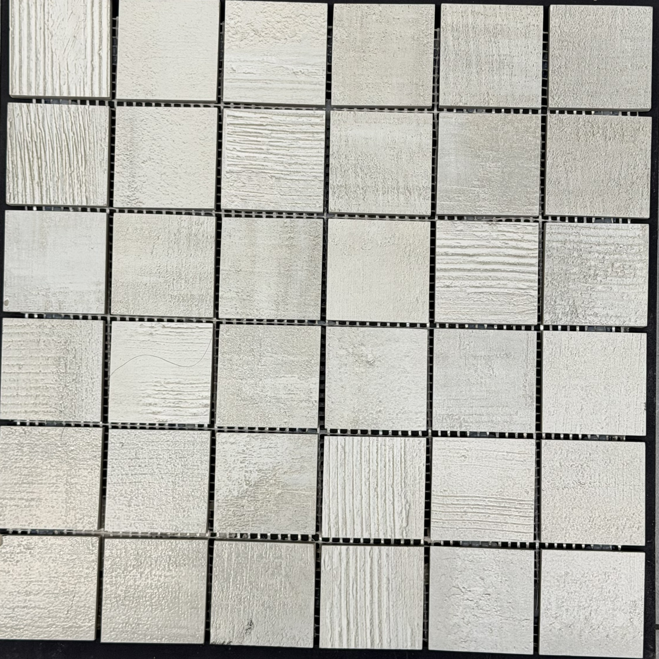 This 2×2 Textured Porcelain Mosaic brings a dynamic, tactile element to modern interior design. Combining various embossed patterns—from linear wood-grain striations to pitted, stone-like stippling—each tile captures the light differently to create a rich, multi-dimensional surface. The cool, off-white and pale grey tones keep the look bright and airy, while the varied textures provide a sophisticated industrial edge. Highly durable and slip-resistant, this mesh-mounted mosaic is a perfect choice for feature walls, backsplashes, or bathroom flooring where you want to balance monochromatic simplicity with striking visual and physical texture.