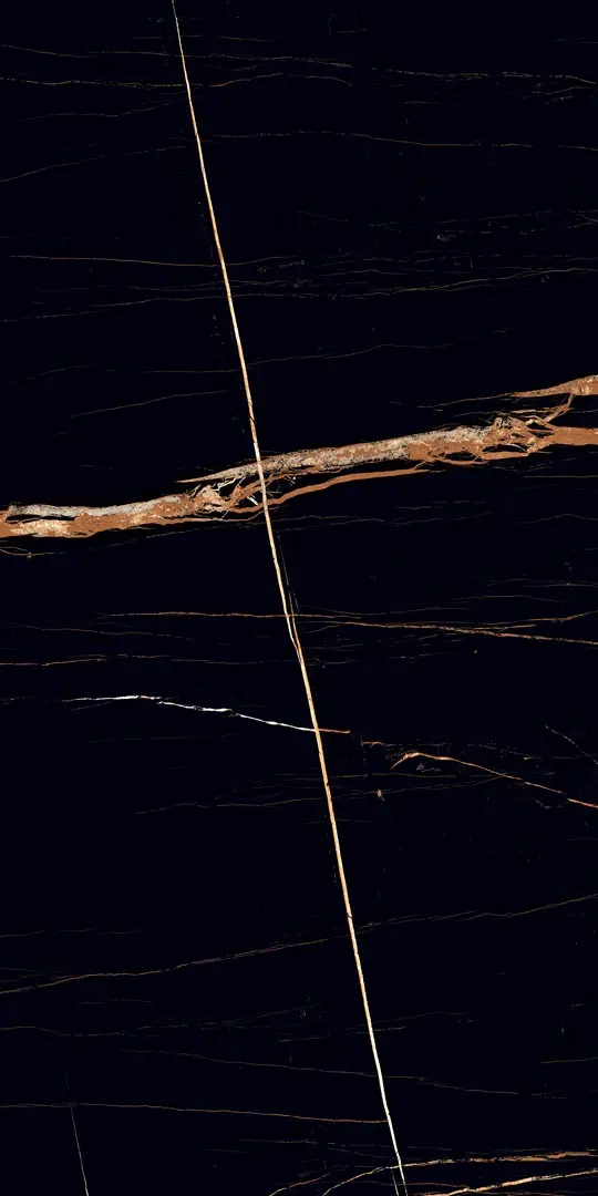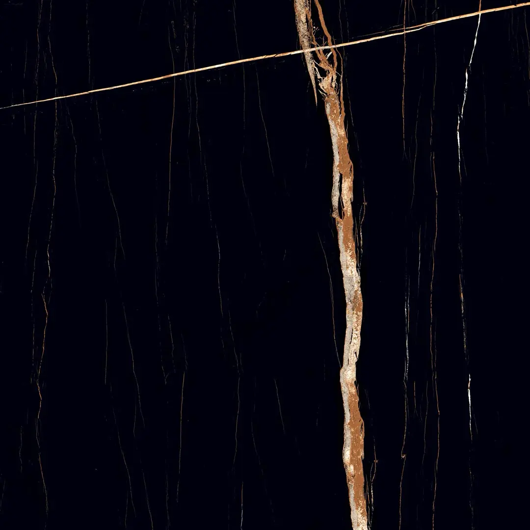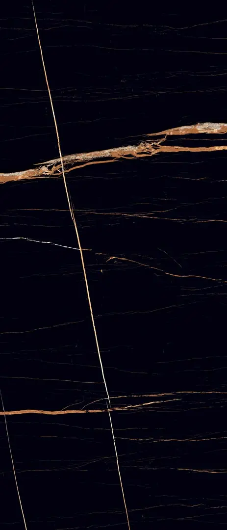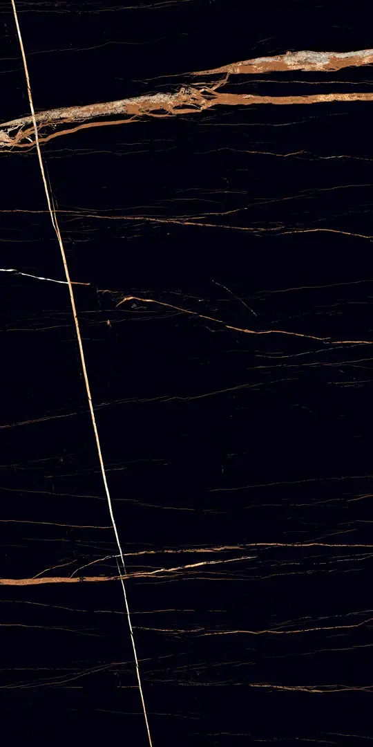 A deep black background enriched with warm golden veining, delivering a dramatic, high-luxury presence suitable for bold, refined interior designs.