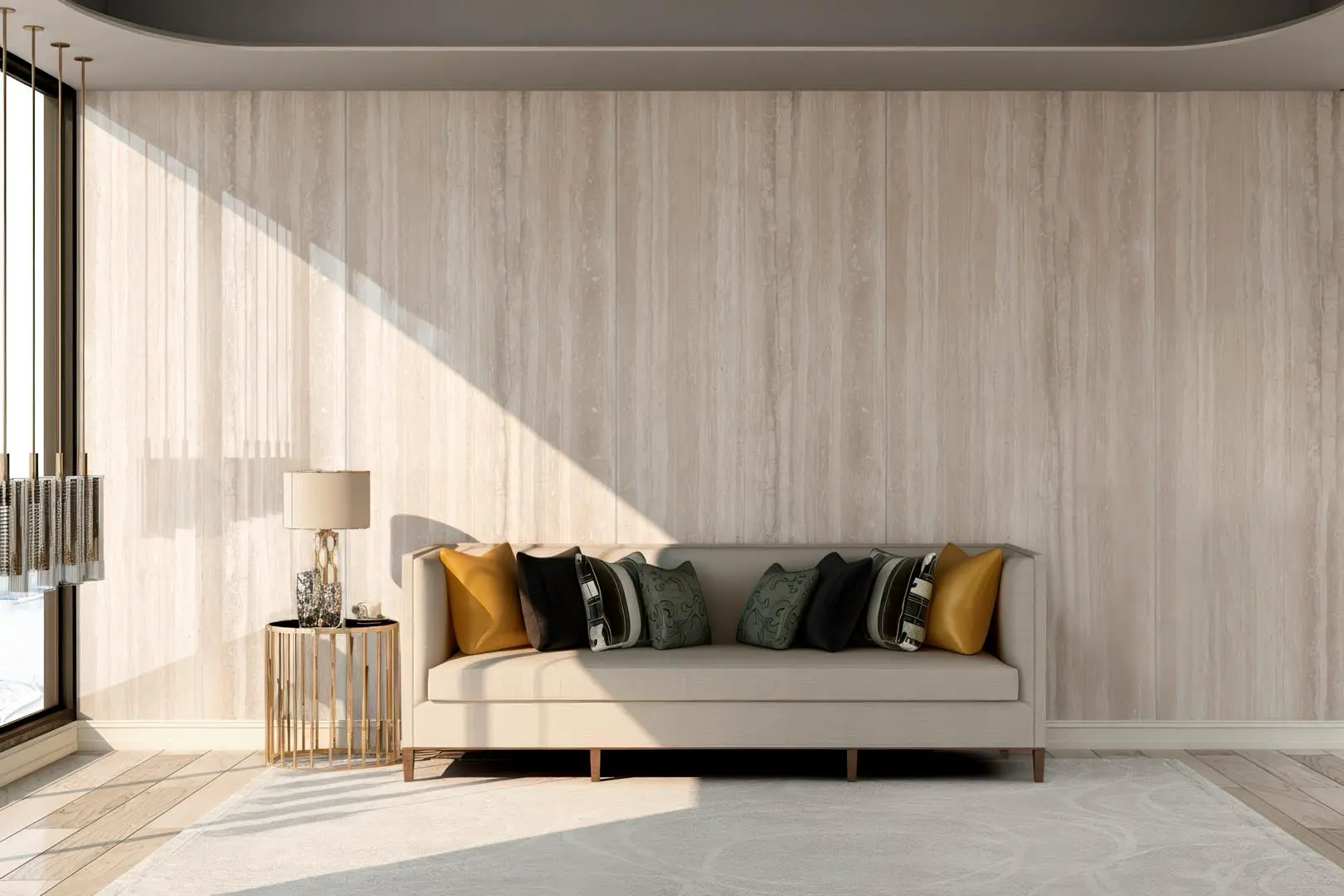 A soft cream travertine look with warm tonal layers, ideal for classic, calm, and inviting applications.