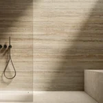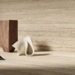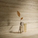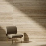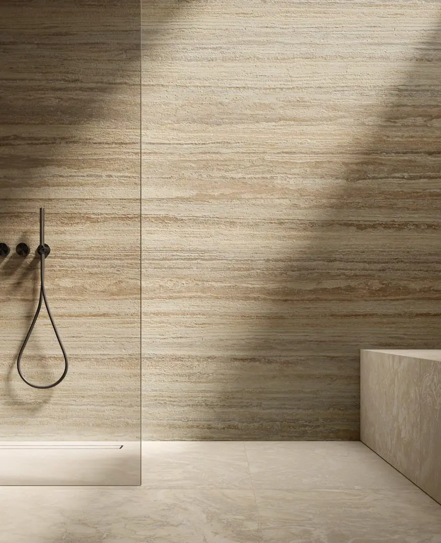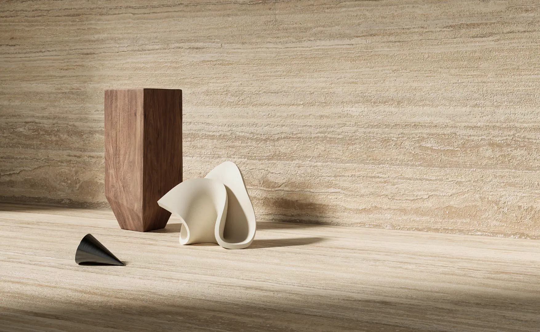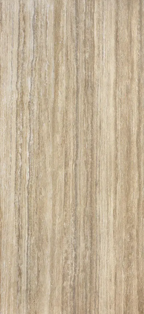 Beige porcelain tile with rich grey and brown tones inspired by natural travertine. It delivers a sophisticated, earthy look for timeless floors and walls.