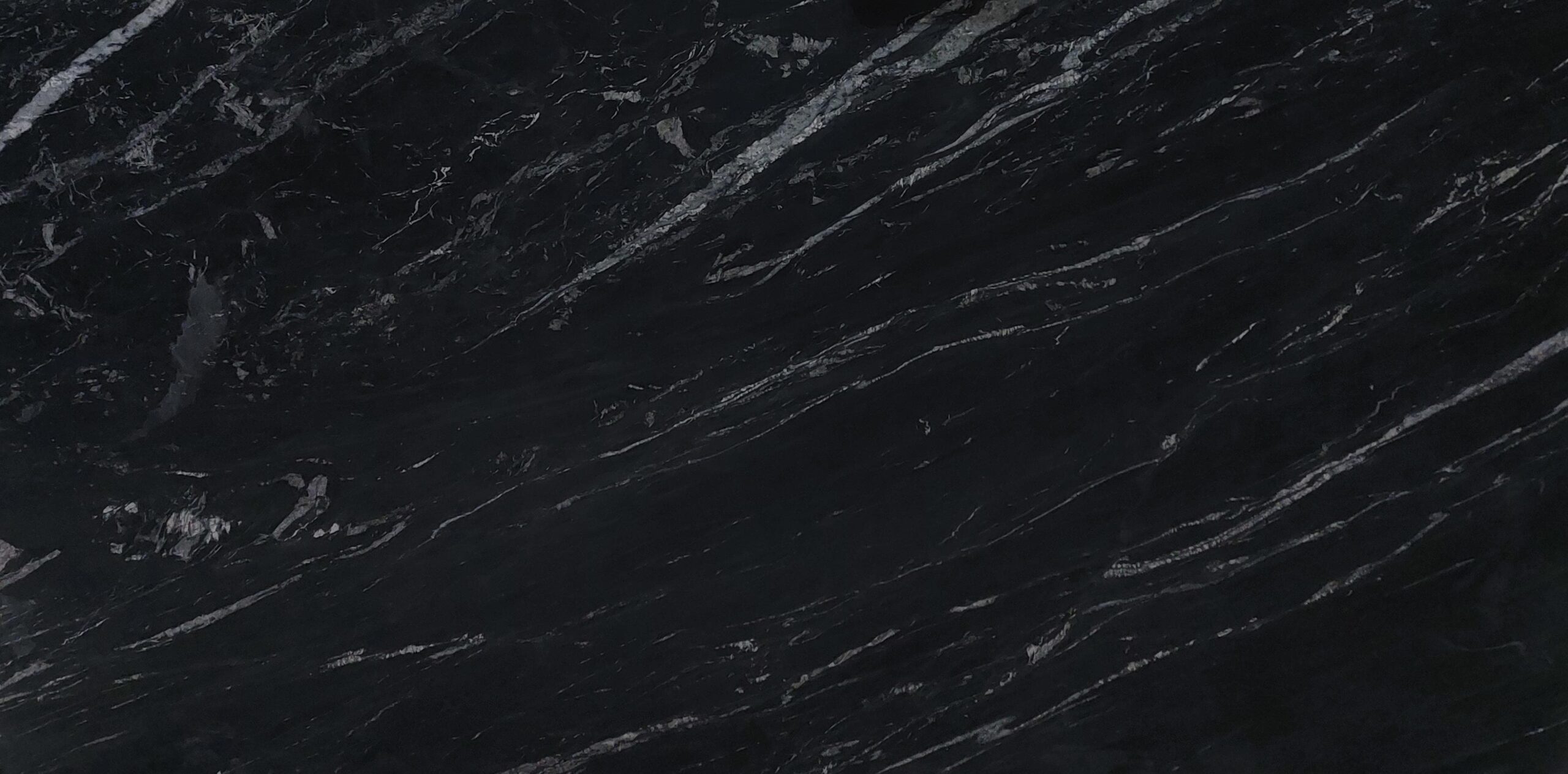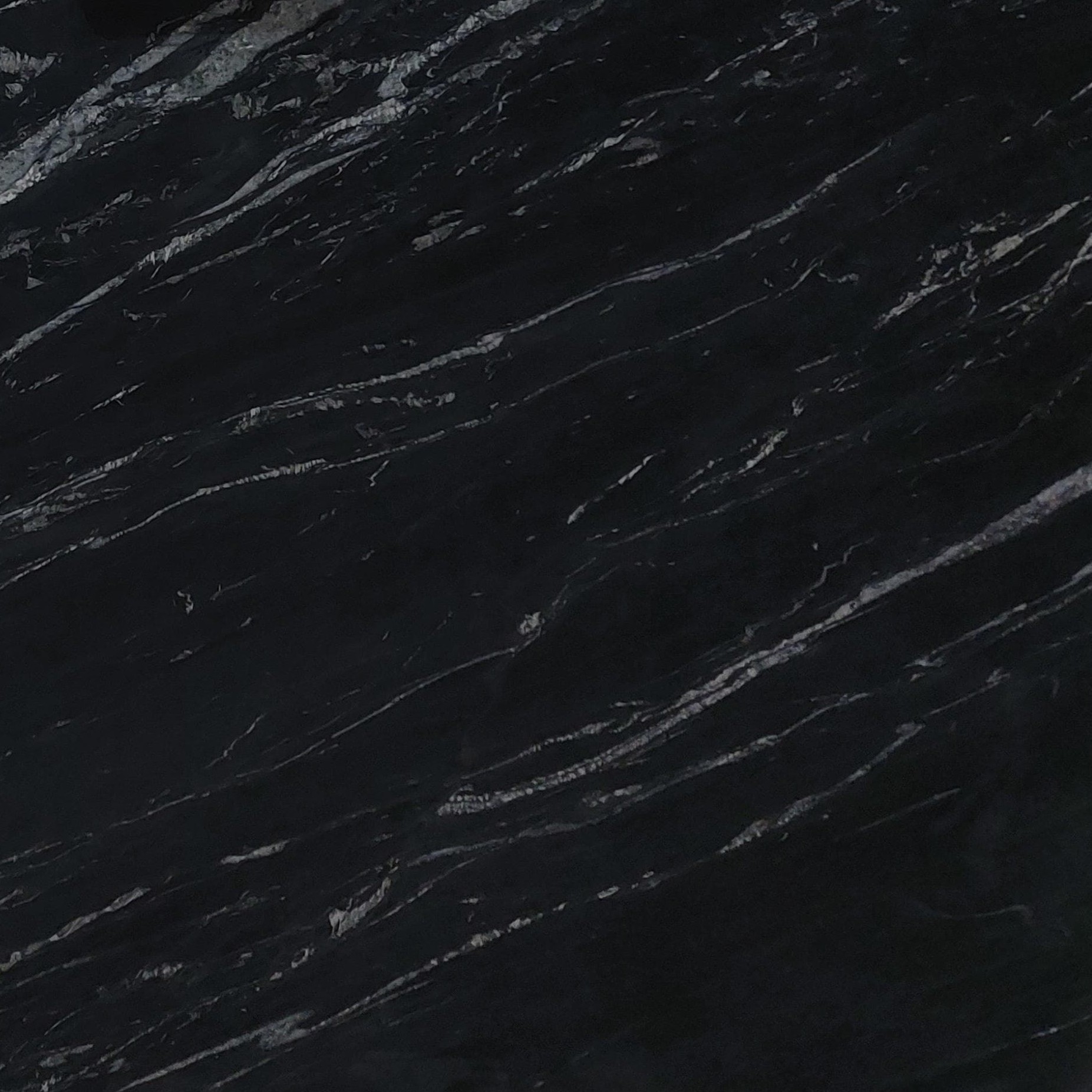 Sleek black natural stone with subtle white and silver veining, offering a bold, modern look perfect for elegant kitchens, bathrooms, and statement surfaces.