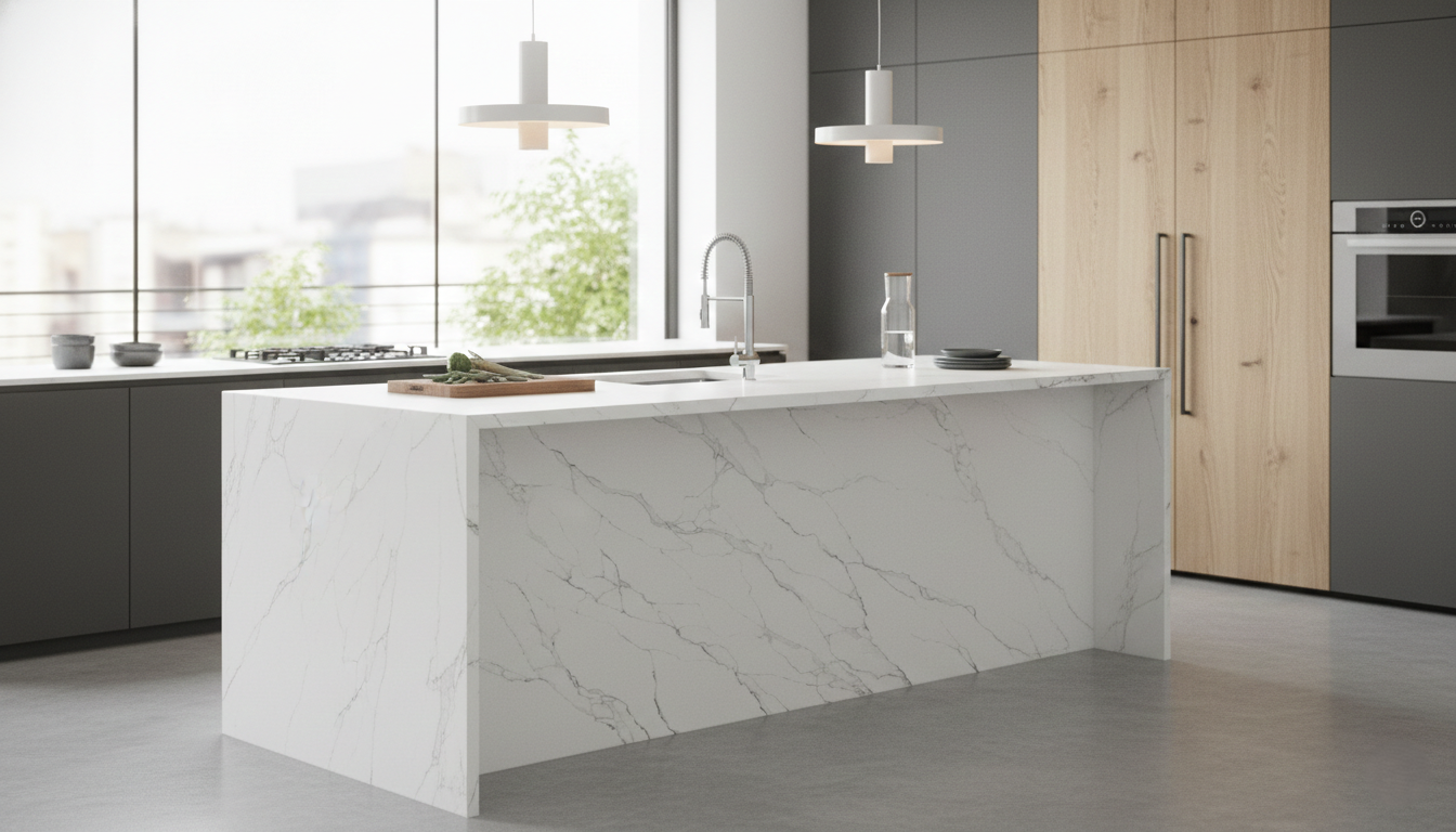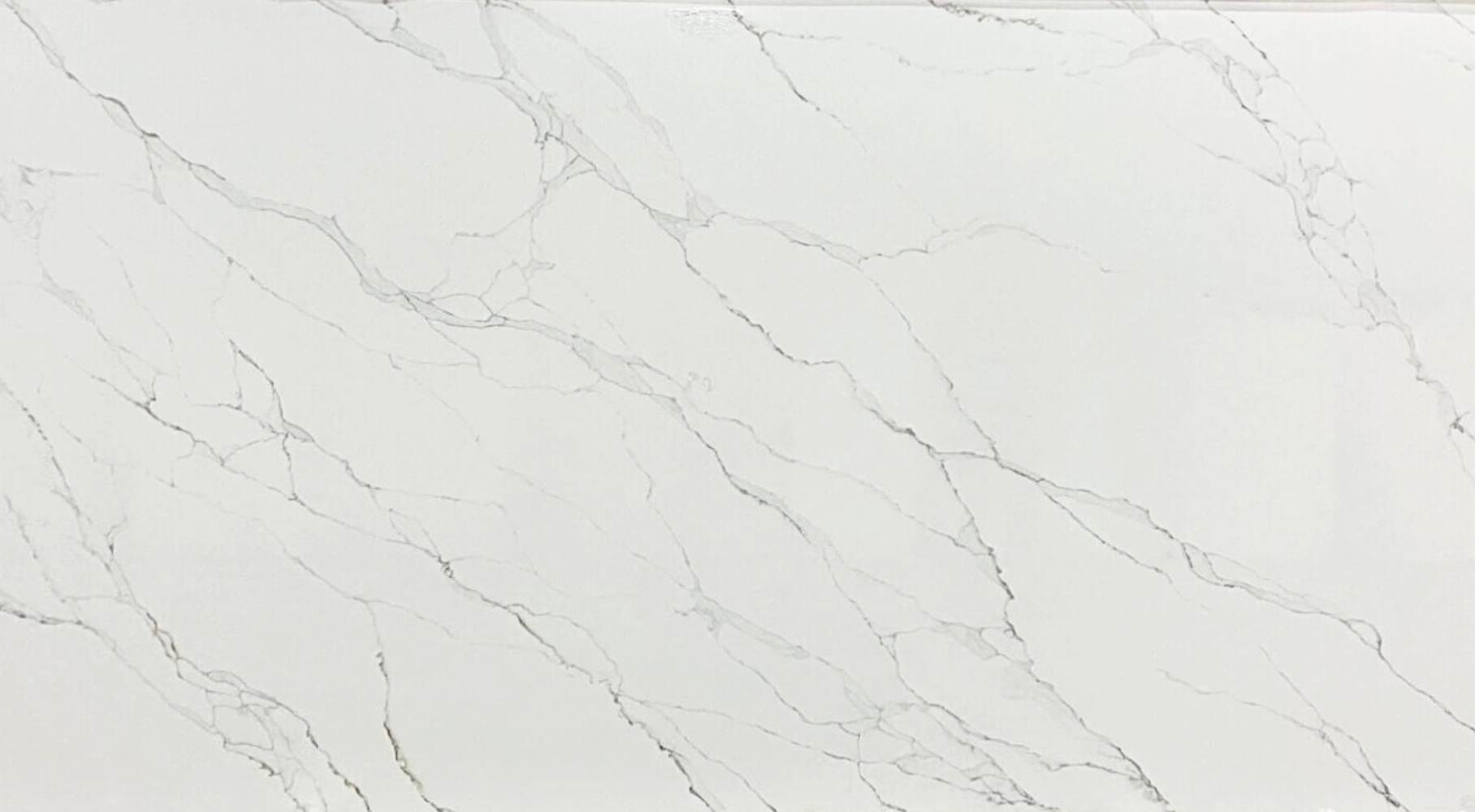 CALACATTA NOAH is a durable quartz surface with a refined look, ideal for kitchens, bathrooms, and high‑traffic spaces.