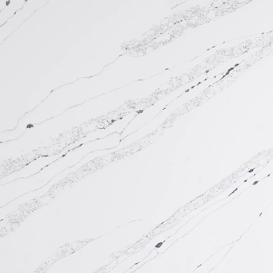 A polished stone surface with soft white tones and flowing grey-blue veining, delivering an elegant and refined look.