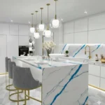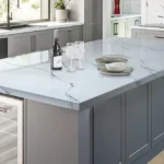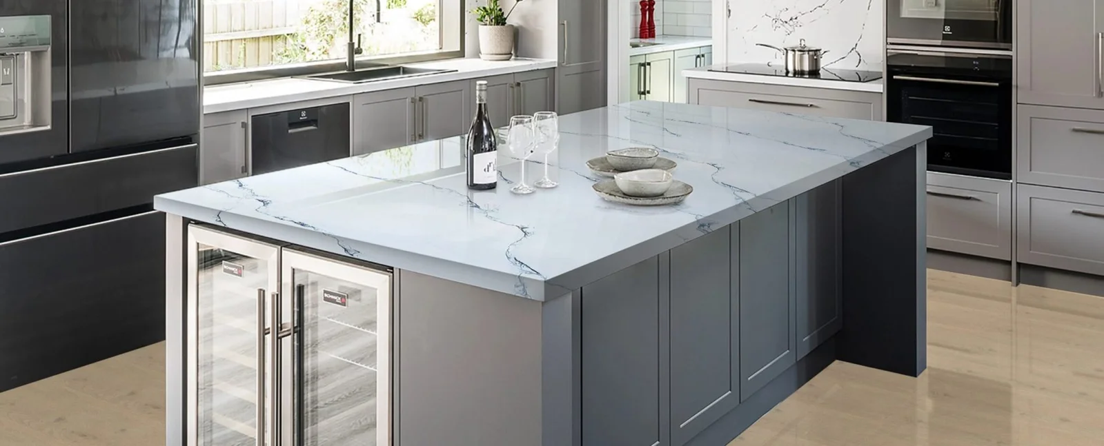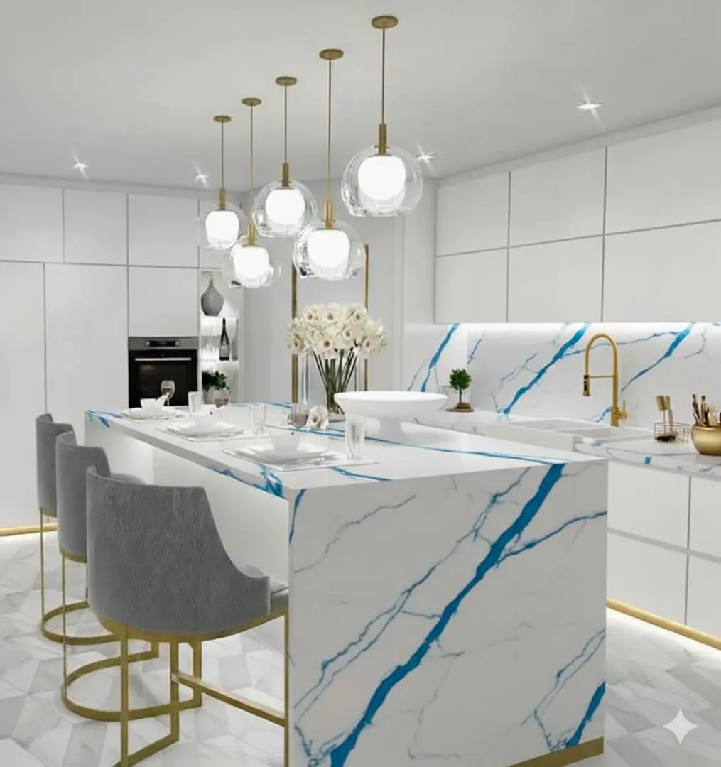 OCEAN BLUE is a durable quartz surface with a refined look, ideal for kitchens, bathrooms, and high‑traffic spaces.