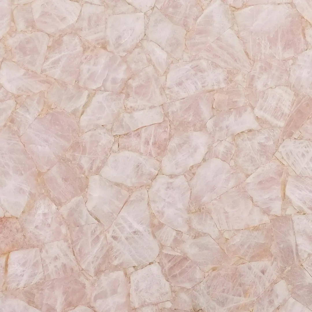 A translucent rose quartz stone surface composed of natural mineral fragments, offering a soft pink tone with luminous depth.