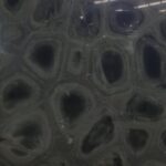 This quartzite is a dark, polished slab featuring a captivating, highly textured pattern. The surface displays irregular, organic-shaped formations, reminiscent of reptile scales or cross-sections of geode structures. The overall effect is sophisticated, natural, and dramatic.