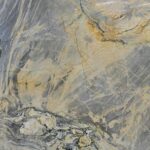 The image depicts a slab of natural stone, which appears to be quartzite based on the file name. It features an intricate, swirling pattern with a dominant palette of soft grey and blue tones, contrasted by striking veins and patches of golden yellow, cream, and darker grey/black. The overall appearance is highly dynamic and luxurious.